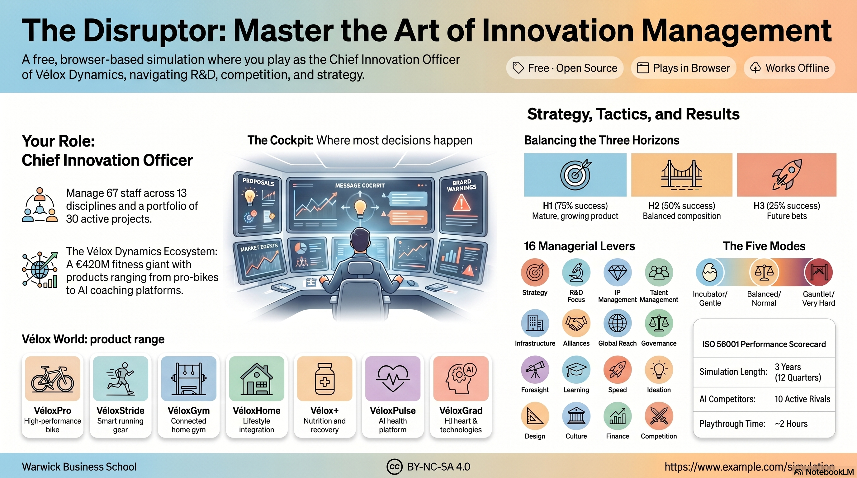 The Disruptor is a single-player simulation in which you run the innovation portfolio of Vélox Dynamics — a Belgian fitness-equipment company trying to reinvent itself. You arrive as the new Chief Innovation Officer with a board behind you, a workforce watching, and a pile of proposals already on your desk.